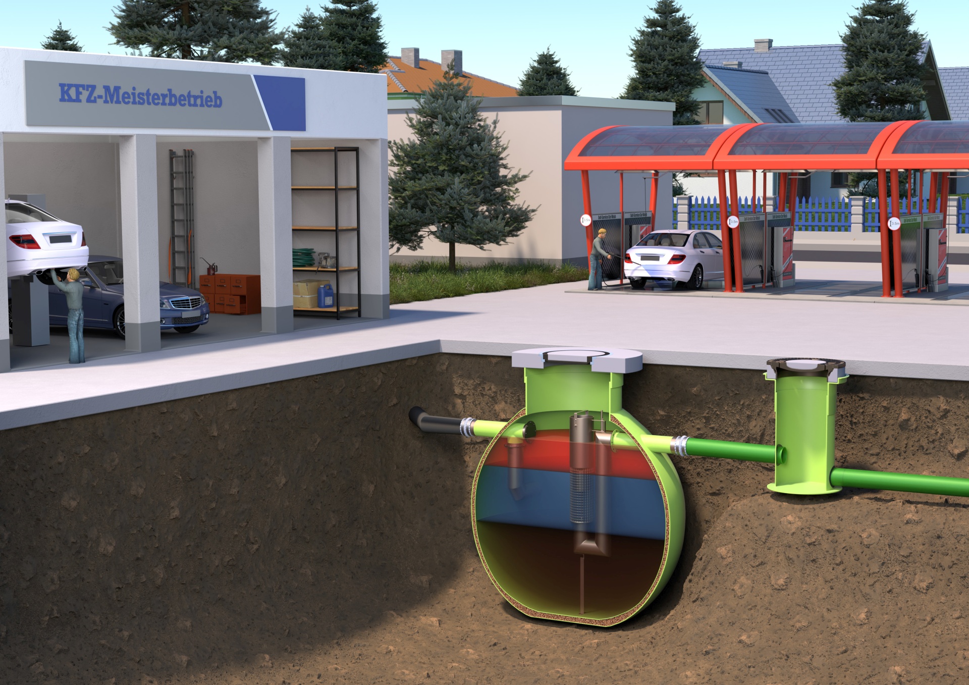 Leichtflüssigkeitsabscheider sind in Betrieben vorgeschrieben, in denen größere Mengen Öl oder Benzin gelagert werden bzw. austreten können z.B.