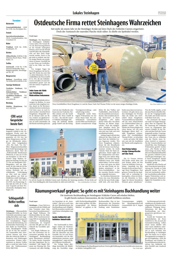 Was die Größe angehe, so hat die neue Flasche dieselben Maße wie ihr Vorgängermodell. Das heißt, mit Sockel wird sie 6,48 Meter hoch sein. Der Austausch der Kruke war nicht von langer Hand geplant. Eher im Gegenteil. Bei der Sanierung des Gebäudes waren im vergangenen Jahr massive Schäden an der Flasche und dem Dach des Turms festgestellt worden. Ursprünglich war lediglich vorgesehen, den Turm neu zu verkleiden und der Flasche einen frischen Anstrich zu verpassen. Für die Verantwortlichen war schnell klar, dass Steinhagens Wahrzeichen gerettet werden muss. „Die Flasche auf dem Dach bringt uns keine Miete, aber sie ist identitätsstiftend für das gesamte Schlichte-Carree und für ganz Steinhagen“, hatte Horst Neugebauer damals im Gespräch mit dem „Haller Kreisblatt“ gesagt.