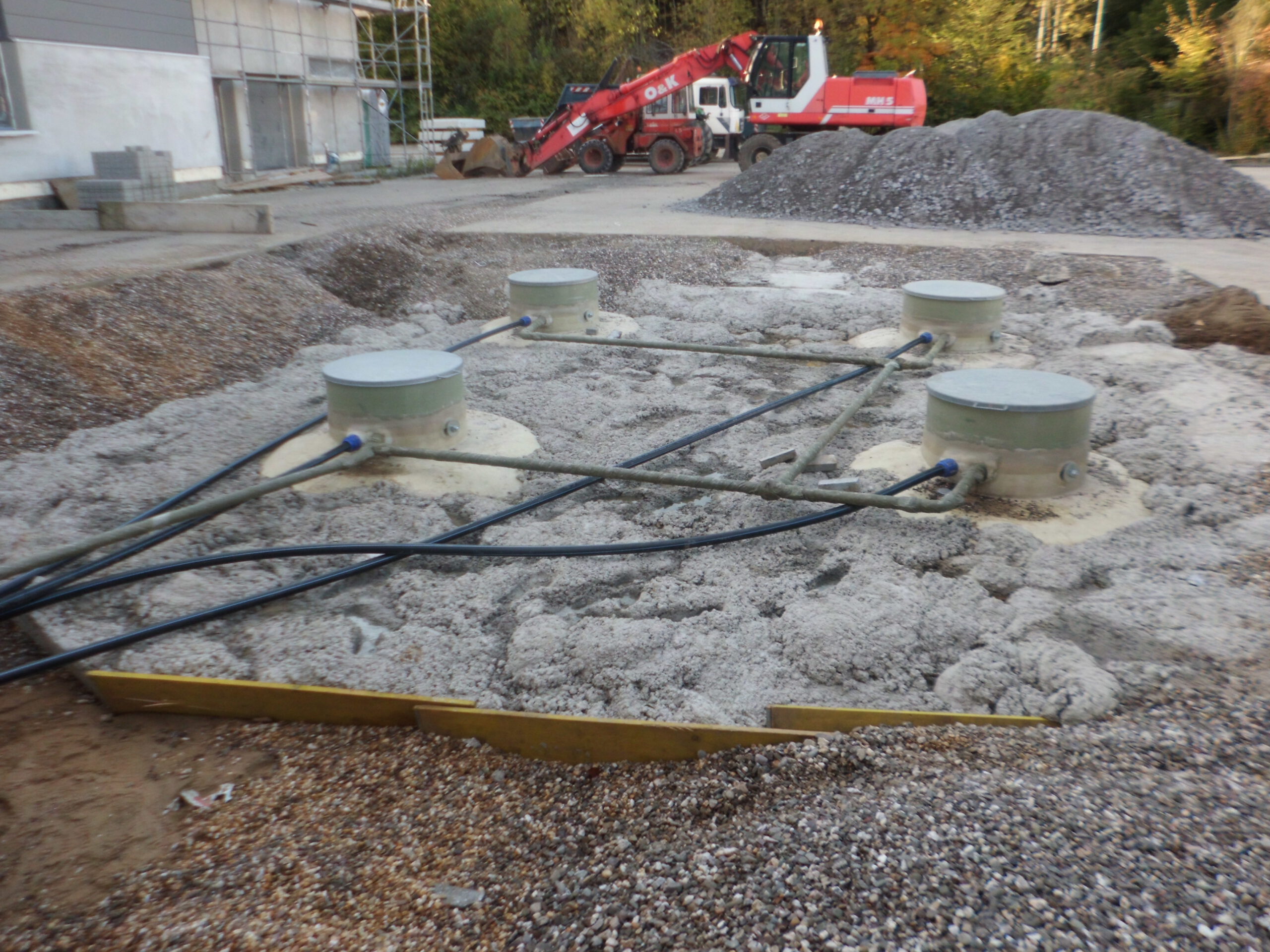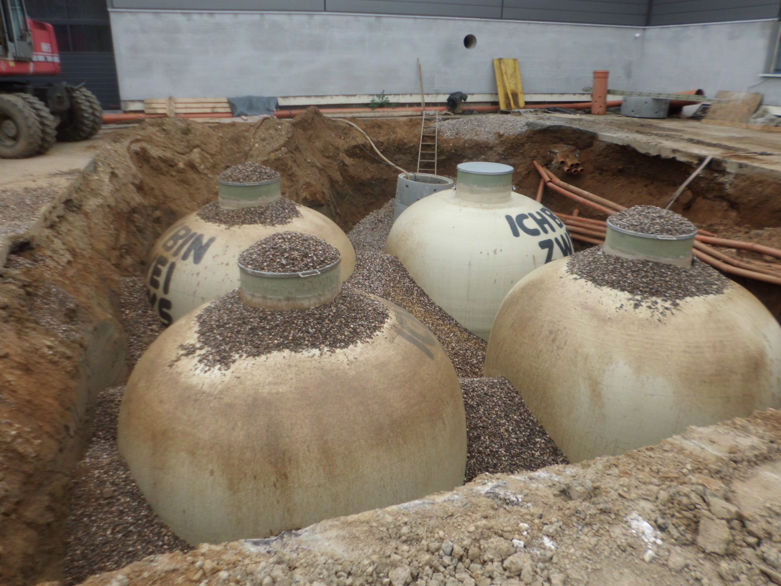 Nach dem Einsetzen der Haase-Erdtanks und dem Verfüllen der Baugrube bis ungefähr zur Hälfte der Grubentiefe wurden die Tanks mit einer Auftriebssicherung versehen. Diese besteht aus einer definierten Menge an Beton und ist selbstverständlich bauaufsichtlich zugelassen.
