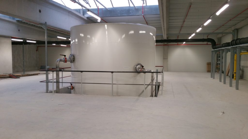 Im ersten Schritt wird das Abwasser in einem 10 m³ großen Haase-Flachbodentank gesammelt. Die Abwärme des Abwassers erhöht mittels eines Wärmetauschers die Temperatur des Brauchwassers von 12 °C auf 45 °C, bevor es in den Wärmespeicher einströmt. Im Speicher wird dann das Brauchwasser über verschiedene Wärmequellen auf bis ca. 60 °C erwärmt.