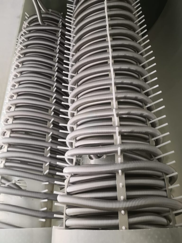 Er verfügt über zwei Wärmetauschersäulen, auf denen die Wärmetauscher für Heizung, Solar und Trinkwasser montiert sind. Der Speicher wird durch die Heizungs- und Solaranlage mit Wärme versorgt. Das warme Wasser wird bei Bedarf aus dem Speicher entnommen.