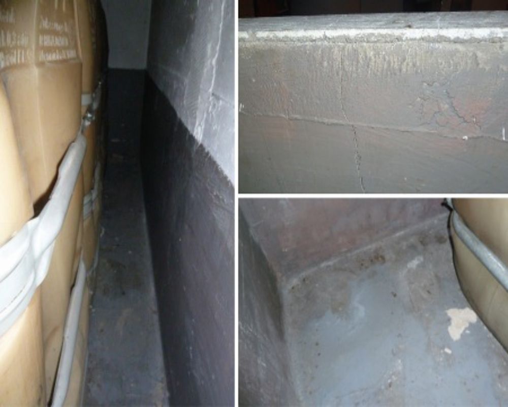 - Ein besonderes Problem: Die Auffangwanne ist nicht mehr dicht, es haben sich Risse und Ausblühungen gebildet, der Anstrich platzt ab